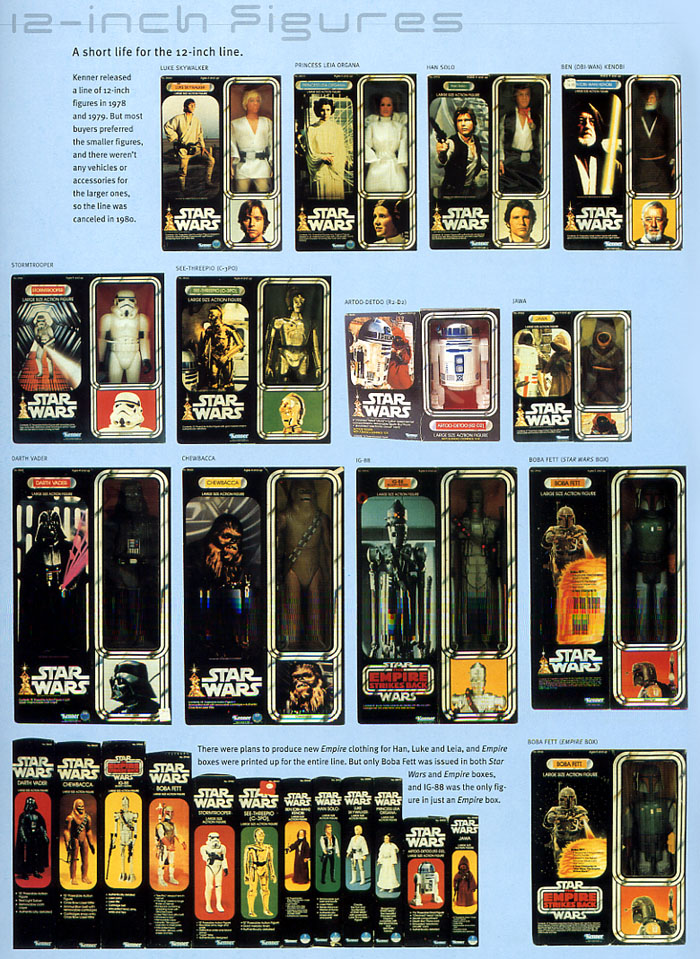 備註:這一系列的掀蓋12"人偶因為不像3.75"人偶可發展出一系列的場景、配備及運輸工具等可供搭配遊戲,在當年並不受玩家青睞,因此Kenner在1980年停產12"人偶系列,原本預定開發的Empire Strike Back盒裝系列,僅出產了IG-88與Boba Fett(另有Star Wars盒裝),新款的Han、Luke及 Leia則取消發行。